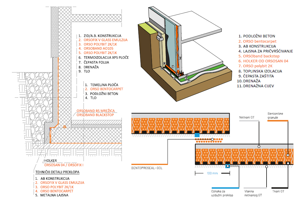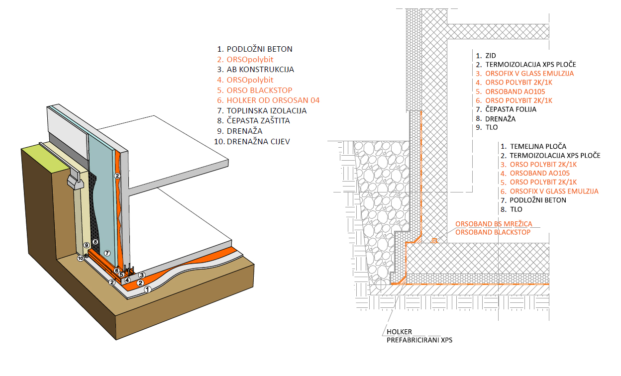 Podzemni dijelovi objekta, građevine, su svi dijelovi koji se nalaze ispod kote nula od razine tla ili svi dijelovi objekta, građevine koji se zatrpavaju ili ukopavaju, npr. podrumi, suterenske prostorije, garaže, podzemne etaže, temelji, ukopani bazeni, vodospremne, septičke i otpadne jame, grobnice i sl. Podzemni dijelovi objekta, građevine, se zaštićuju ORSO polimerbitumenskim sustavom u fazi izgradnje, sa strane pozitivnog tlaka odnosno kad je djelovanje voda (tekućine) na hidroizolaciju pa na konstrukciju objekta. ORSOpolybit je jednokomponentni (dvokomponentni), visokofleksibilni bitumenski premaz sa vezivnim prahom pogodan za nanošenje gletelicom, četkom ili prskanjem. Premošćuje pukotine, ima visoku prionjivost i ne sadrži otapala. Ukoliko se radi o procjednim vodama, dobro dreniranijim i manje zahtjevnim objektima, građevinama, ORSOpolybit se može koristiti u jednom radnom koraku minimalne debljine od 2 mm. Ukoliko se radi o akumulirajućim vodama naokolo objekta, ORSOpolybit sustav se koristi u dva radna koraka uz obavezno armiranje prvog sloja sa alkalnootpornom mrežicom ORSOband. Kontakt tlo temeljna ploča, tlo vertikalne plohe.